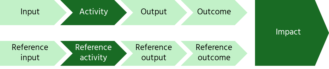 In impact terms, Roxy cigarettes have a (small) positive marginal impact, while they have a (large) negative absolute impact. To understand what these concepts mean, we look at the impact pathway. This can be used to define impact. In fact, the impact of an activity is the difference between the outcomes of that activity and those of the reference activity.